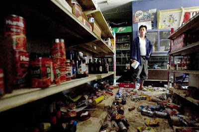 By the end of the first week, shit would really hit the fan.  Assuming that the water would continue to run, those of us in cities and towns would soon realize “Crap, I’m out of food.”  Every grocery store and market would be ransacked in a flurry of blind panic.  With all transportation completely frozen, the stores would soon run out of food.  Farmers would likely find ways to live off their land.  But the rest of us would be totally fucked.  People would start dying of starvation, falling, or eating random poisonous stuff.  There might even be some cannibalism.